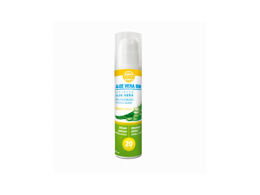 Aloe vera opaľovacie mlieko SPF 20 poskytuje strednú UVA a UVB ochranu. Hydratuje, chráni pokožku pred spálením, vysušením a poškodením slnečnými lúčmi. Mlieko sa ľahko aplikuje, je odolné voči vode, piesku a potu, bez syntetických farbív a minerálnych olejov. Ideálne pre citlivú a opálenú pokožku, vrátane detí od 1 roka.
