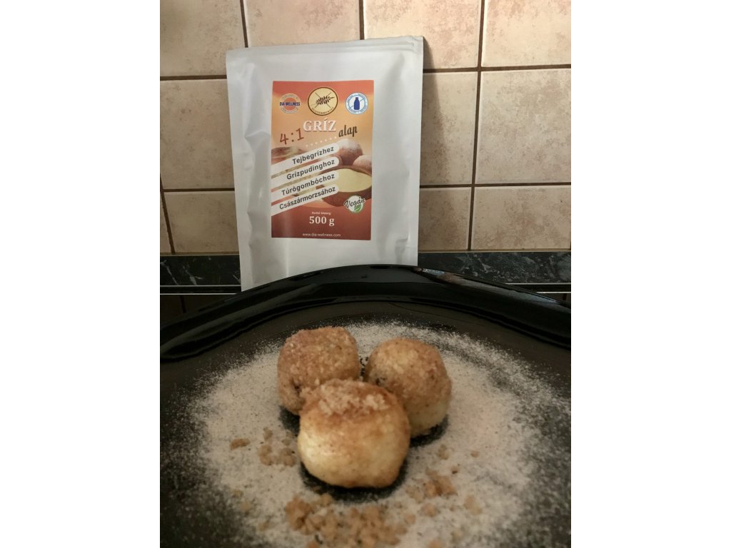 Tvarohové guľky: 250g tvarohu (alebo náhrada tvarohu), 2 vajcia (náhrada vajec), 6 g DW Sladidla 1:4, 1 štipka soli, 50 g Bezlepkového krupicového základu 4v1.