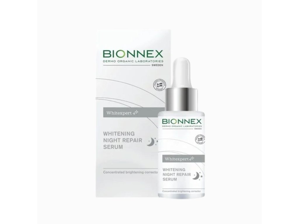 Bionnex Whitexpert bieliace nočné sérum redukuje pigmentové škvrny, rozjasňuje pleť a podporuje jej regeneráciu. Obsahuje extrakt z chaga huby, kurkumu, vitamín C, ktoré regulujú tvorbu melanínu a zjednocujú tón pleti. Vhodné aj pre citlivú pleť.