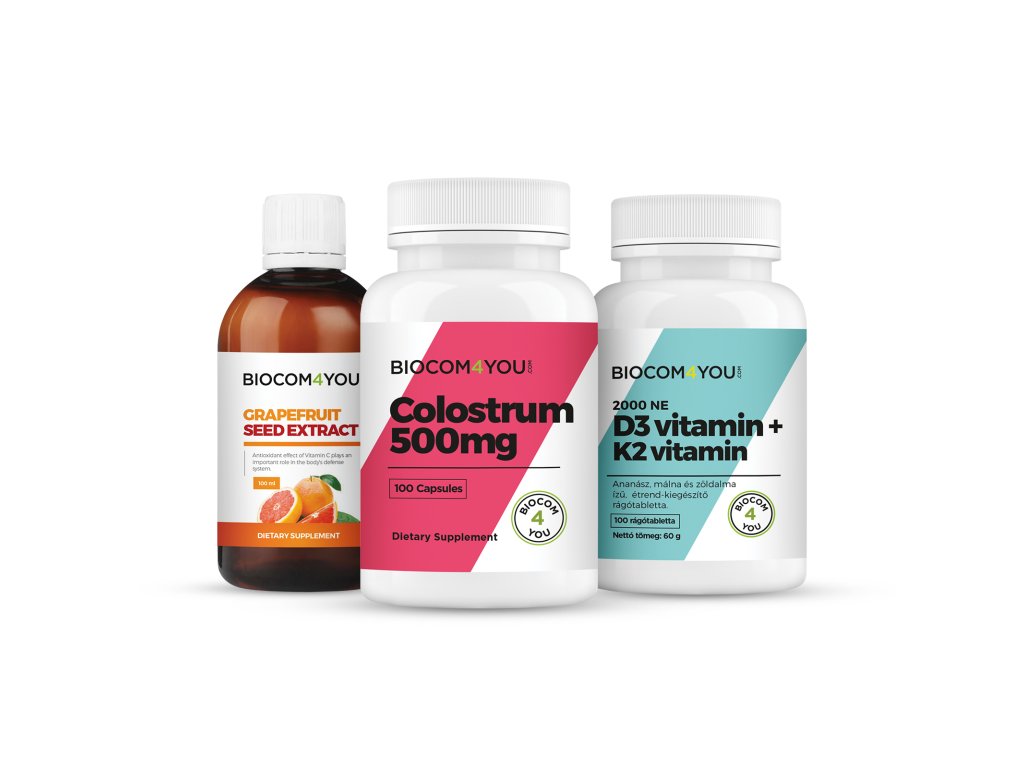 Balíček na posilnenie imunity, ktorý obsahuje 1 Colostrum, 1 balenie kapsúl D3 2000 a 1 fľašu 100 ml extraktu z grapefruitov.