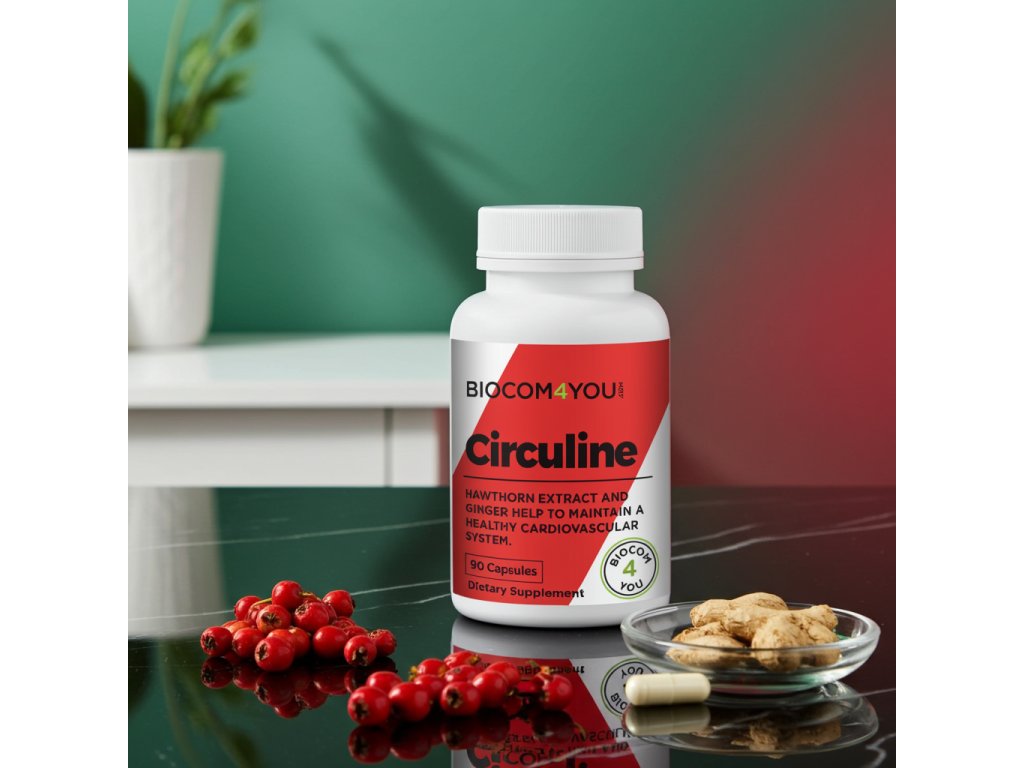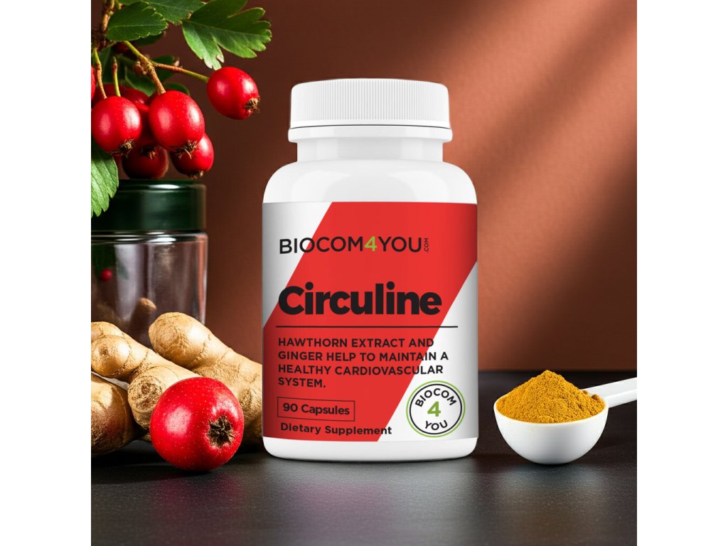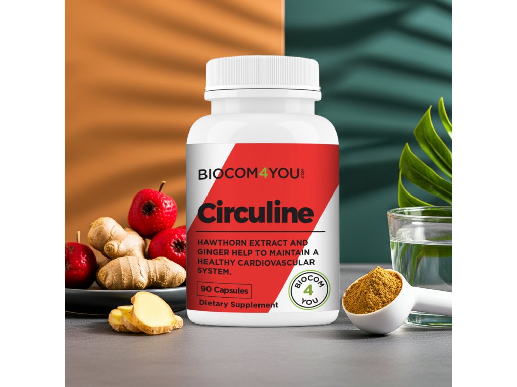 Biocom Circuline – komplexný prírodný doplnok pre zdravý krvný obeh a pevné cievy. Obsahuje hloh, zázvor, L-arginín a ďalšie účinné látky, ktoré podporujú srdce, regulujú krvný tlak a zlepšujú cirkuláciu krvi.