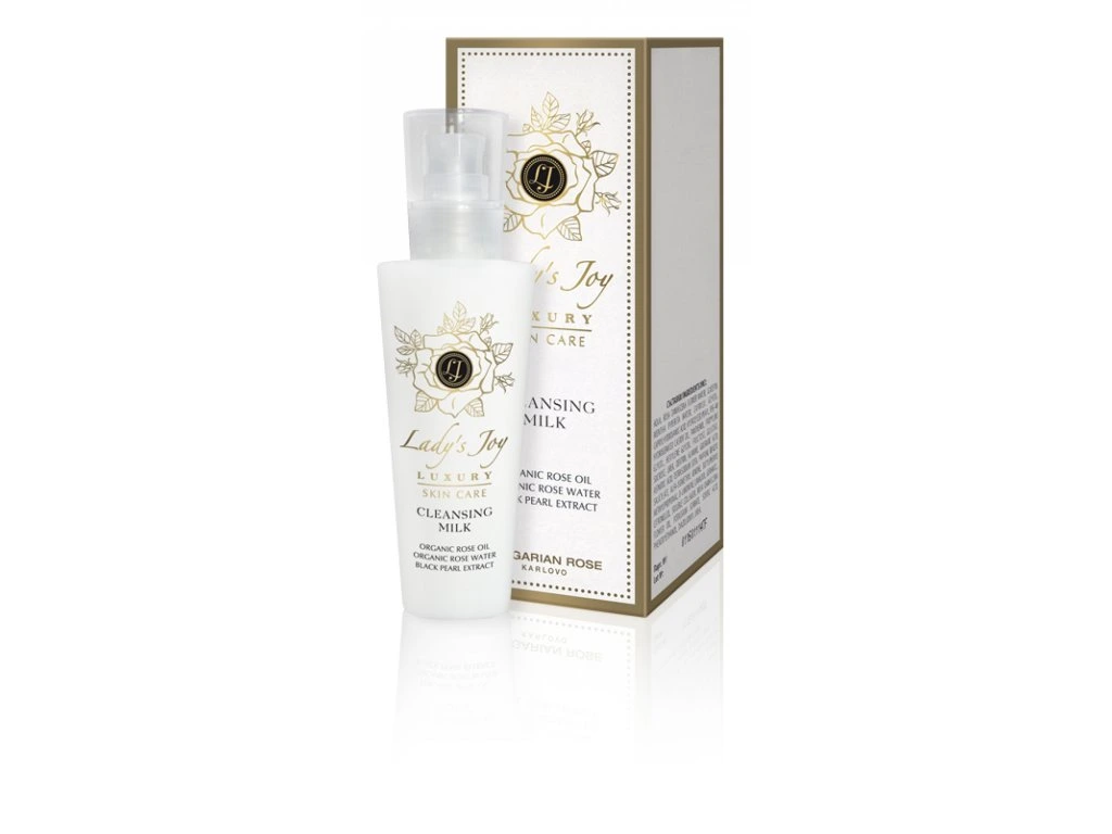 LADY’S JOY LUXURY Cleansing Milk jemne odstraňuje make-up a nečistoty, hydratuje pleť a podporuje jej regeneráciu vďaka bio ružovému oleju, ružovej vode, extraktu z čiernej perly a moringovému oleju.