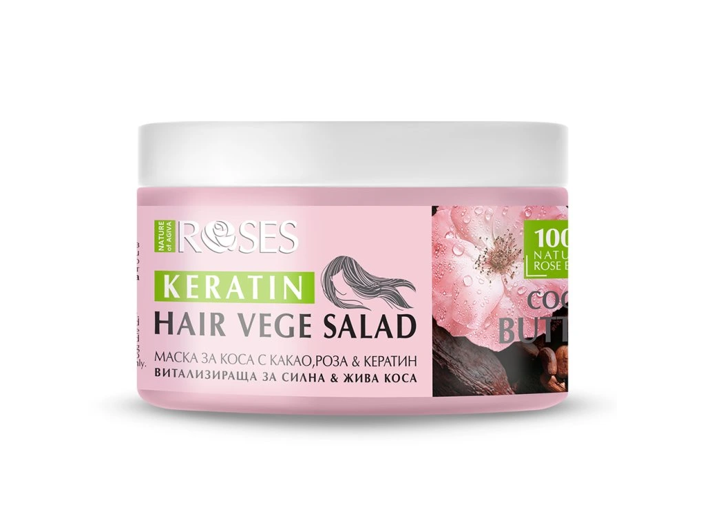 Vitalizačná maska na vlasy ROSES VEGE SALAD s ružovým elixírom, kakaovým maslom a keratínom intenzívne vyživuje, hydratuje a regeneruje vlasy po celej dĺžke. Posilňuje vlasové vlákno, zlepšuje pružnosť a dodáva vlasom lesk, hebkosť a zdravý vzhľad bez zaťaženia. Vhodná pre všetky typy vlasov, najmä suché a namáhané.